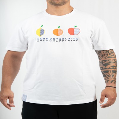 La t-shirt ha una vestibilità regolare in tessuto cotone elasticizzato con stampa frutta sul davanti.
