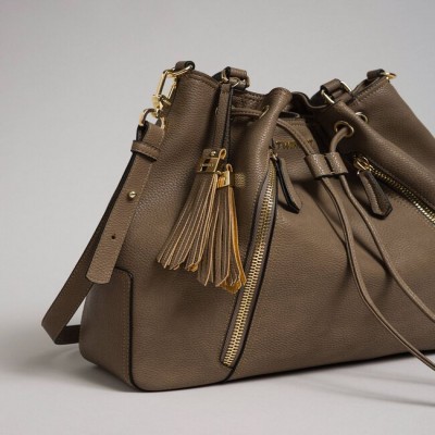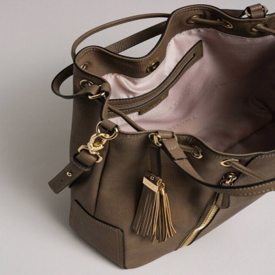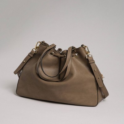 Borsa secchiello grande in similpelle con doppia tasca, doppio manico e tracolla regolabile e removible.