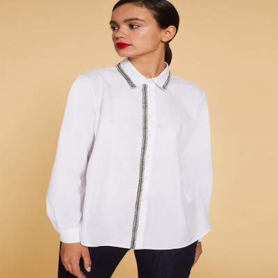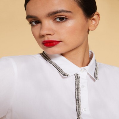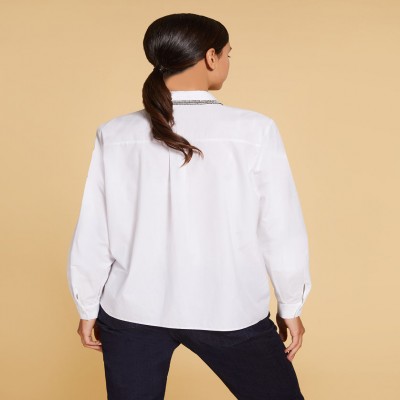 Camicia in popeline di cotone comfort, dalla linea diritta, con colletto e apertura rifiniti da passamaneria, maniche lunghe con polsino e bottone, taglio carré e cannoncino sul retro.