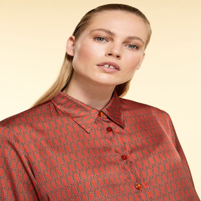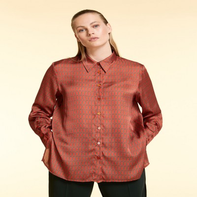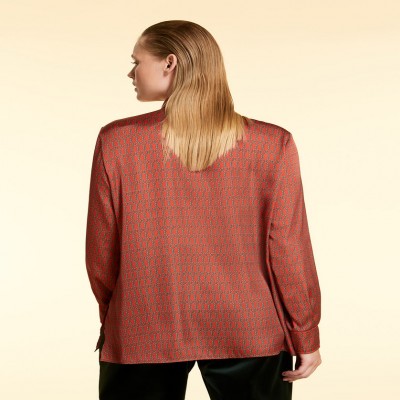 Camicia in raso stampato, dalla linea diritta, con maniche lunghe, polsini e bottoni, spacchi laterali al fondo. Chiusura con bottoni.