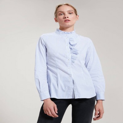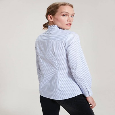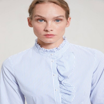 Questa camicia in popeline stretch ruba le righe a bastoncino dal guardaroba maschile e le addolcisce con un tocco di ruches – piccola a contorno dello scollo e asimmetrica sul davanti. Taglio slim, bottoni a boule perlata. Perfetta con il tailleur, ma anche con i jeans.
