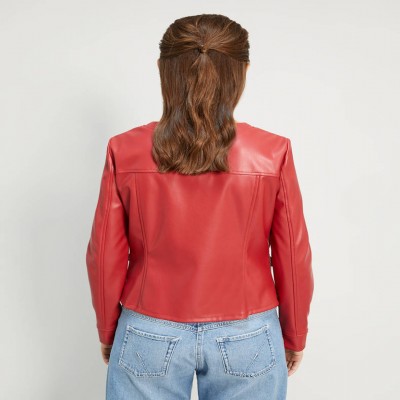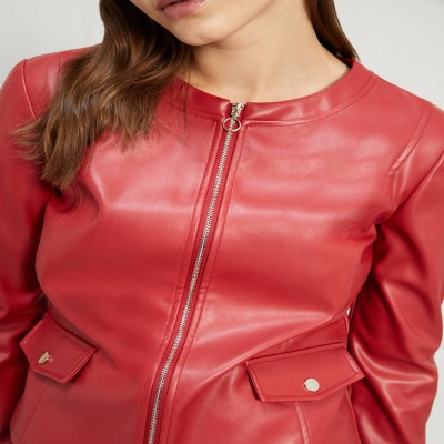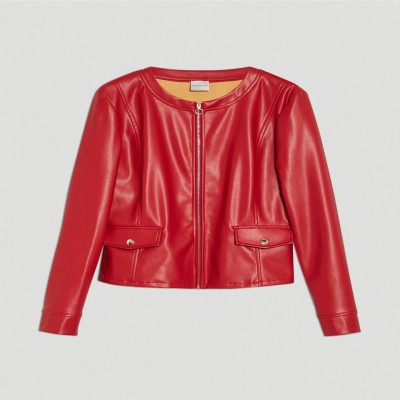 Rosso fiammante per segnalarsi nel viavai cittadino con la giacca in jersey spalmato. Design pulito a girocollo, taglio slim con lunghezza che sfiora i fianchi, fodera accoppiata