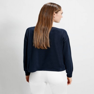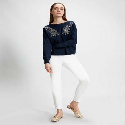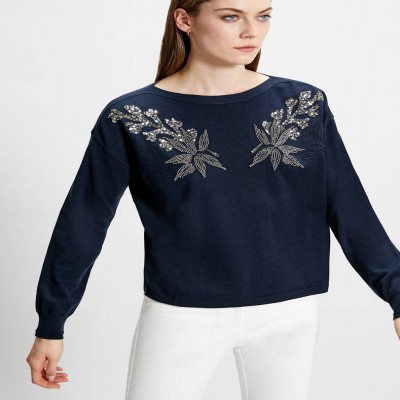 Un bijou di maglia, con ricami floreali di perline e paillettes silver su sfondo blu. Scollo a barchetta, fit regolare in cotone comfort. Perfetta in abbinamento al denim, per aggiungere un tocco di glamour allo stile quotidiano.