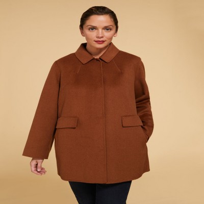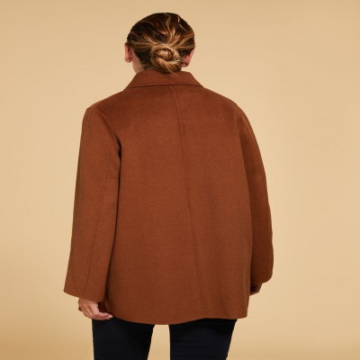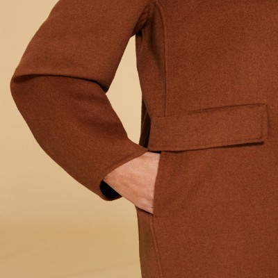 Cappotto in double di misto lana, cucita a mano, dalla linea leggermente svasata, con colletto a camicia, maniche lunghe, tasche inserite con patta davanti. Sfoderato. Chiusura coperta con bottoni a pressione.