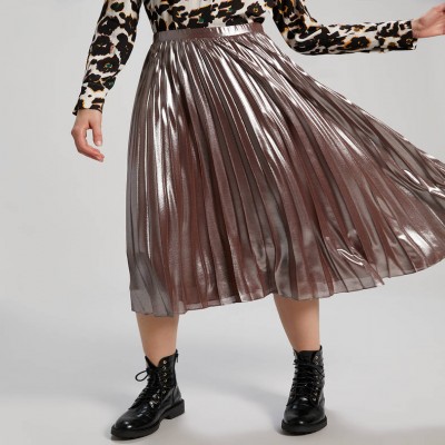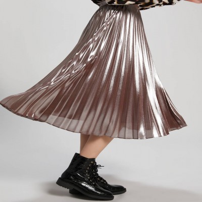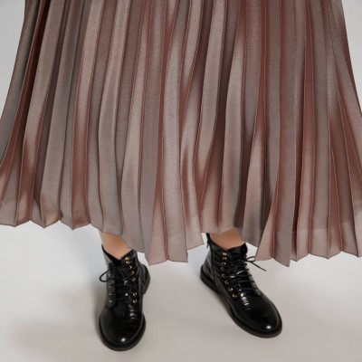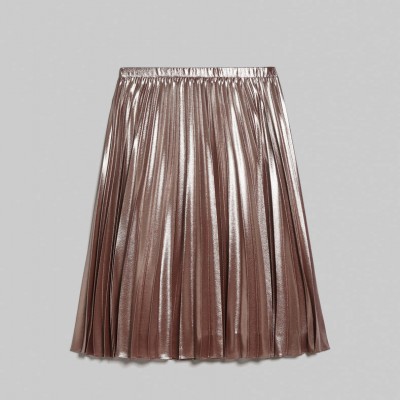 Sempre chic, ora anche glam. La gonna midi in georgette plissé, fluttuante e frusciante, si accende di riflessi laminati a ogni passo. Vita elastica, foderata. Da abbinare agli anfibi con texture coccodrillo per dare il giusto twist al look.